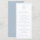 Simple dusty blue wedding menu with your monogram in a circle at the top and your menu options surrounded by a thin border. The header and your names are in an elegant handwritten script font. The classic, traditional layout makes this menu great for a formal winter wedding.