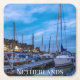 Traditional fishing town night scene. square paper coaster