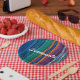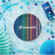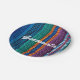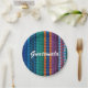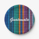 A traditional fabric weave pattern found in Guatemala. The design is bright and multicolored with red, blue, and yellow stripes. This is a photograph of fabric. Text is fully customisable. Remember your last trip to Latin America with this colourful piece.