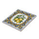 This traditional Italian majolica ceramic tile features a central illustration of a lush lemon branch heavy with citrus and delicate white blossoms, framed by an ornate Majolica-style border of golden scrollwork against a deep cobalt blue background.