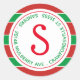 Red, green and white stripes backdrop a white circle with a red outline around your monogram and return address on a label sticker.