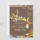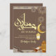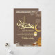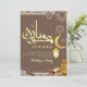 A culturally rich Eid card featuring a Holy Quran on a Rehal (reading stand), prayer beads, and a glowing lantern. Decorated with traditional brown floral patterns and geometric stars.