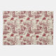 An intricate red and cream pattern of a traditional Santa Claus delivering presents in a snowy village amongst roaming deer.