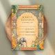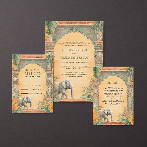 Amaze your guests with this elegant south Indian theme wedding RSVP card featuring beautiful traditional columns and vintage architectural elements decorated with marigold flowers and banana leaves.