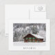 Postcard of a traditional wooden log cabin house with green shutters in a forest in the snow in winter in Bavaria at the border between Germany and Austria with a white border and the text: 'Bavaria'.