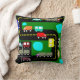 This throw pillow has a geometric design of trucks and cars on a road and in a parking lot.