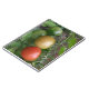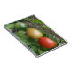 This awesome notebook features a photograph of a bunch of ripening tomatoes including a red, orange and green cherry tomato in a line, growing on a tomato plant in a suburban garden. The photograph was taken using macro photography for a detailed result.
