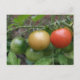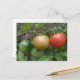 This beautiful postcard features a photograph of a bunch of ripening tomatoes including a red, orange and green cherry tomato in a line, growing on a tomato plant in a suburban garden. The photograph was taken using macro photography for a detailed result.