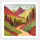 An abstract landscape with unique textures showing a mountain landscape with a hiking trail and trees and beautiful sunrays in shades of red, crimson, yellow, and green.