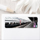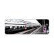 A train station in Switzerland with a train moving past. The train is not next to the platform, and there is nobody waiting at the platform. This is a photograph converted into a painting.