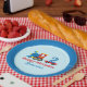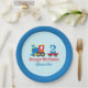 This blue custom paper plates features a cute train engine pulling one care with a number on it. Change the number to match the birthday child's age. The plate says Happy Birthday and has a place for the child's name as well.