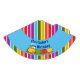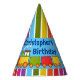 Colourful cartoon toy train on a blue banner. Templates to add your name or delete the text in the text boxes to leave blank. Multicoloured rainbow striped background.