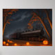 Introducing our stunning "Train Through a Halloween Forest" Poster, an exquisite piece of wall art that captures the breathtaking beauty of the fall season. This masterpiece transports you to a serene journey through a forest ablaze with the fiery hues of autumn leaves and will add a bit of mystery to any home this harvest season.