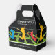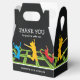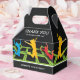 Kids birthday thank you party favour boxes featuring a plain black backdrop, trampoline courts, kids jumping and flying through the air, and a thank you template that is easy to customise.