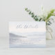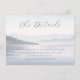 This enclosure card features a serene watercolor landscape with soft blues and grays, creating a tranquil and elegant atmosphere. The design showcases a calm body of water reflecting misty mountains, evoking a sense of peace and natural beauty. Prominent cursive typography highlights "The Details," while clean sans-serif text provides instructions for further information, making it ideal for formal occasions like weddings. The minimalist yet sophisticated style emphasizes simplicity and clarity, inviting guests to explore more through the provided website link.