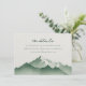 This wedding enclosure card features a serene and nature-inspired design with a minimalist layout on textured, off-white paper. The color palette includes soft, muted greens that create a tranquil atmosphere, complemented by an abstract watercolor mountain range at the bottom. Elegant cursive typography highlights "the details," while simple serif font provides clear instructions for further information, ensuring both style and readability. The overall mood is peaceful and inviting, making it perfect for couples seeking a harmonious and natural aesthetic for their special day.