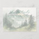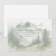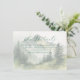 This wedding enclosure card features a serene, nature-inspired design with a mountainous landscape as the focal point, surrounded by pine trees. The colour palette includes soft greens and muted earth tones, creating a tranquil and calming atmosphere. The art technique resembles a hand-painted watercolor effect, adding an ethereal quality to the minimalist and contemporary style. Elegant script typography highlights "The Details," while classic serif text provides additional information, making it perfect for conveying important event details in a peaceful and inviting manner.