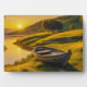 The delicate rays of the golden morning sun cast themselves over the peaceful lake, where a boat awaits on the grassy bank to be set upon the tranquil waters.