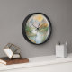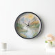 The size of the clock is dramatic and the abstract alcohol ink design is soothing and intricate at the same time. I chose the black frame that adds pop to the blue and gold design. The gold printing would be better in a slightly darker or larger font. I love it and I’m looking for just the right place in ny new apartment. I would recommend this clock for a personal gift or a present. I feel that the quality is excellent for the money! I’m a bit of a clock nut so I’m pretty particular about my purchases. The clock is larger in diameter than many if the clocks I have, so it stands out very well. I think a slightly darker printing color and a moderately larger size would best suit a professional decor or add more impact in a work place item.
