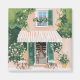 A gouache from a picturesque café with green shutters and floral balcony overlooks a vibrant outdoor seating area. Sunlight filters through, inviting patrons to enjoy a peaceful moment amidst blooming greenery.