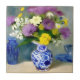Tranquil Vase of Flowers Print. Transform your space into a tranquil retreat with this stylised watercolour vase of flowers. Soft blues, yellows, and purples create a restful ambiance.