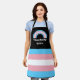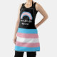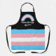 Medium-sized apron with an image of a transgender pride flag and a rainbow; pink, white, and blue design on a black background, with a customisable text template for your own name or message