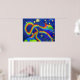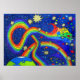 A colourful rainbow is leaving the globe and disappears into the blue space, transforming itself into spaceballs and stars.