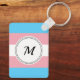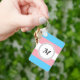Keychain with the transgender pride flag with rainbow stripes of blue, white, and pink, trans pride design with a custom text field for your initial