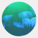 Atmospheric photograph of transparent jellyfish swimming in a blue / green sea.