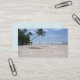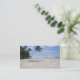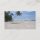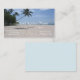 Tropical paradise. Palm tree over an empty sandy beach, with the ocean and waves beyond. Travel agency business card