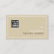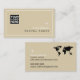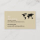 A modern and elegant beige business card to promote tourism professionals... Company logo, your name with custom travel related occupation (travel-agent) and thin white frame... and address for contact, and profession related words at the back, with the image of the map of the world...