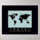 A graphic map of the world with a black frame and a travel inspirational text: 'A journey of a thousand miles must begin with a single step' by Lao Tzu philosopher