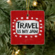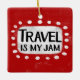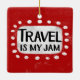 "Travel Is My Jam" is a fun text design with a white accent shape surrounded by white whimsical textured dots.