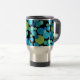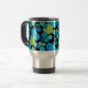 A vibrantly coloured Travel Mug with a 'Blue Moons' abstract pattern in bright blues and neon green on a black background; from a handpainted paper collage design by Judy Adamson.