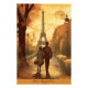 Vintage travel poster of a romantic couple walking in Paris towerds the Eifel Tower while the sun sets. Warm orange and yellow colours.