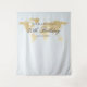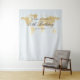 Custom Personalised Backdrop for a photobooth or selfie station at a travel theme birthday party with their name, age, and party or birth date printed on a soft fabric tapestry with our yellow gold colour world map and a light blue background. The type style is reminiscent of fonts used on vintage maps and old globes, but the design is simple so that your guests are the ones who shine in each photograph taken at the entryway of your event.