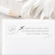 Modern Minimalist Travel Theme Return Address Label for a destination wedding or travel theme bridal shower with a retro inspired aesthetic shown in grey and white typography with an aeroplane heart trail wedding monogram logo in the corner. Colours and fonts are editable so you can use this template to match your exact travel theme reception suite.