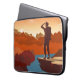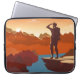 Traveller or explorer with backpack, standing on t laptop sleeve