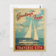 This Greetings From Traverse City Michigan vintage travel nautical design features a boat sailing on the water with seagulls and a blue sky filled with gorgeous puffy white clouds.