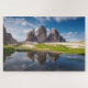 Photo jigsaw puzzle with the famous three peaks of the Tre Cime di Lavaredo or Drei Zinnen Dolomites mountain with reflection in the water of a puddle on a beautiful day in South Tyrol/Trentino Alto-Adige in Northern Italy.