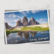 with reflection in the water of a puddle on a beautiful day in South Tyrol/Trentino Alto-Adige in Northern Italy with a white edge and the text 'Drei Zinnen' (with shadow). The image is a bit rotated to create the illusion of it laying loose.
