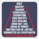 Updated for mid-August 2018 events. This design started as a pyramid and seems to have become a tower. Remind your community about what President Trump does while he's at work every day. Customisable design. Text summary: Golf. Bigotry. Treason. Conspiracy. Corruption. Emoluments. Self-Dealing. Constant Lies. Abuse of Power. Obstruction of Justice. Unindicted Co-Conspirator. Your President at Work. Design description: Midnight blue background. White text, stacked from shorter words or phrases at the top of a pyramid to longer words or phrases at the bottom, with the following words or phrases, "Golf. Bigotry. Treason. Conspiracy. Emoluments. Self-Dealing. Constant Lies. Abuse of Power. Obstruction of Justice." Below the white text, the following text in red, forming the bottom of the pyramid, "Your President at Work." On each side of the pyramid is a red line, tilted at angles that draw attention to the pyramid shape.