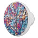 An abstract art design of a small woodland tree in blues, reds and brown colours.