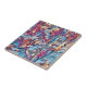 An abstract art design of a small woodland tree in blues, reds and brown colours.