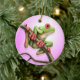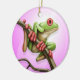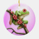 A green tree frog is perched on a branch in front of a light pink background. The frog is looking off to the right with one of it’s bright red eyes visible. The little guy’s red hands and feet are wrapped around a slim brown branch that begins at the bottom of the design and moves up and to the left. This bright and colorful design makes a cute and playful ornament.