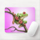 A green tree frog is perched on a branch in front of a light pink background. The frog is looking off to the right with one of it’s bright red eyes visible. The little guy’s red hands and feet are wrapped around a slim brown branch that begins at the bottom of the design and moves up and to the left. This bright and colorful design makes a cute and playful mousepad.