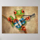 This cute design by artist Jeff Bartels features a small green tree frog holding a scratched and worn acoustic guitar. The flag of the Canadian province, Quebec is painted on to the old guitar giving it a patriotic look. The adorable tree frog musician is sitting on a small branch and is looking forward with its large red eyes. The over sized head and small body along with the details on the skin and guitar create a beautiful combination of a cartoon and realistic look. This unique and patriotic Quebecois tree frog guitarist pattern is perfect for all animal and music lovers.