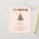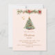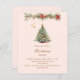 A winter invitation for a Christmas party. A soft cream, beige background on the front decorated with a watercolored hand-drawn pine tree with red and golden ornaments. Some stars and a Christmas decorated garland with cones and red Poinsettia flowers. Personalise and add your party details.
