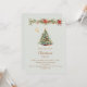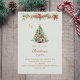A winter invitation for a Christmas party. A soft, light sage green background on the front decorated with a watercolored hand-drawn pine tree with red and golden ornaments. Some stars and a Christmas decorated garland with cones and red Poinsettia flowers. Personalise and add your party details.
