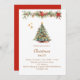 A winter invitation for a Christmas party. A white background on the front decorated with a watercolored hand-drawn pine tree with red and golden ornaments. Some stars and a Christmas decorated garland with cones and red Poinsettia flowers. Personalise and add your party details.